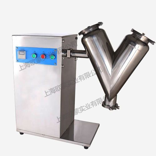 型混合機是由兩個圓筒成V型焊接起來的容器組成,容器的形狀相對與軸是非對稱的。由于回轉運動,粉體粒在傾斜圓筒中,連續的反復交替、分割、合并;物料隨機地從一區傳遞到另一區,同時粉粒體粒子間產生滑移,進行空間多次疊加,粒子不斷分布在新產生的表面上,這樣反復進行剪切、擴散混合,且無混合死角。