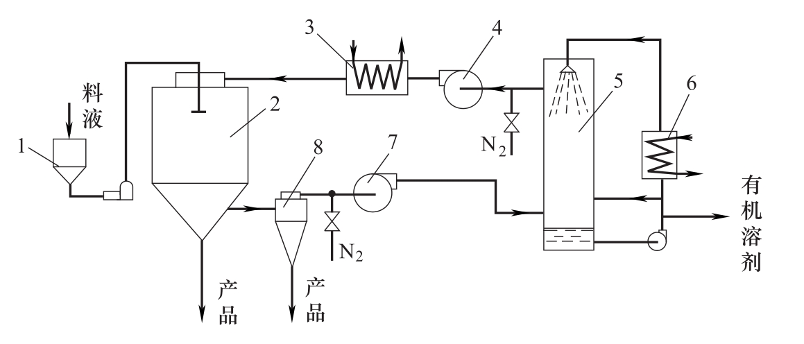 閉路循環噴霧干燥機系統,是基于干燥介質為惰性氣體(如N2氣等)的再循環和再利用。當然,特殊情況下也可以用空氣,如空氣-四氯化碳系統。干燥系統部件間的連接處,要保證氣密性密封,干燥室在低壓(約200mmH2O左右,即0.196kPa)下操作。其流程如圖所示。