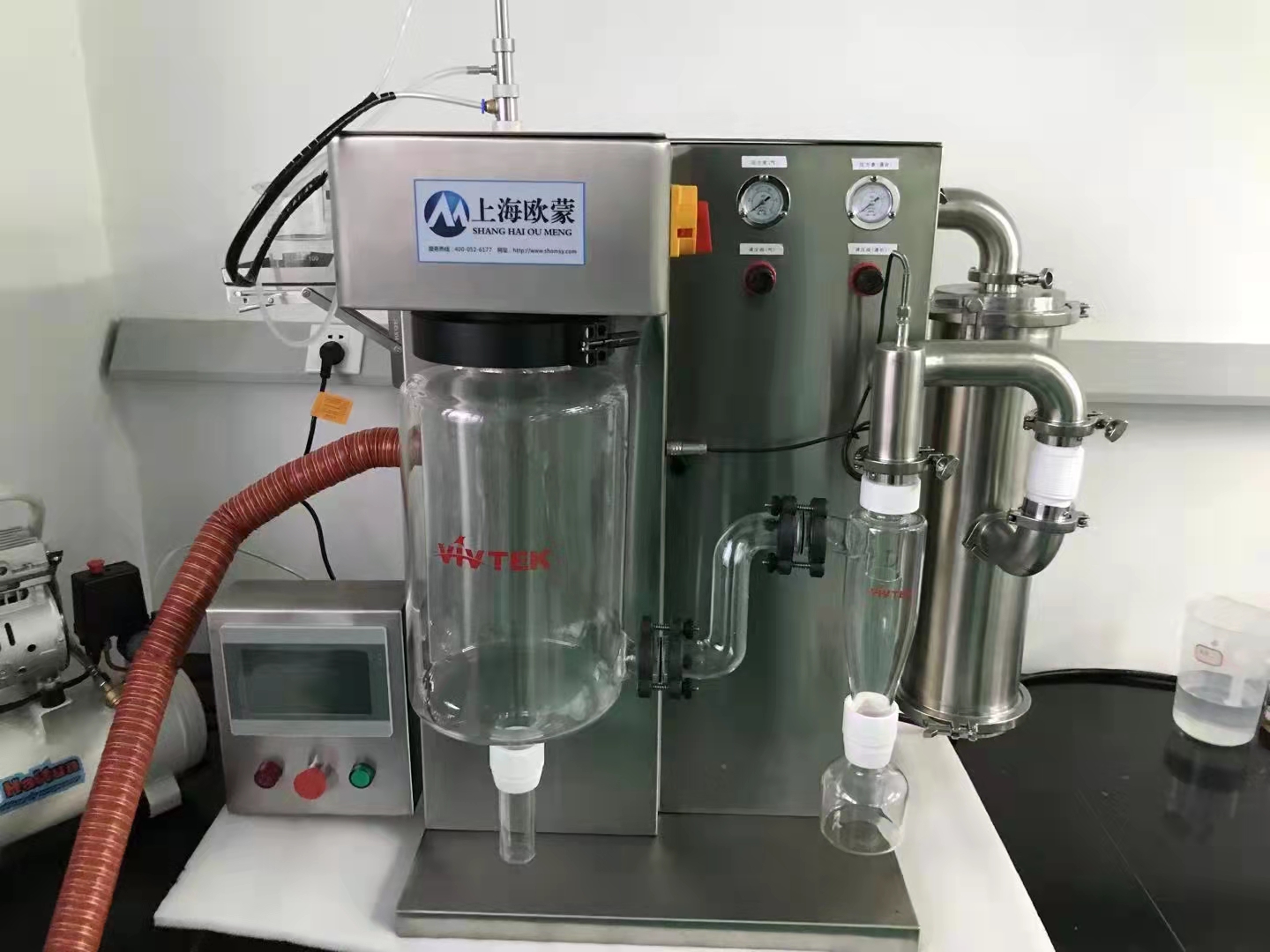 (16)可搭配OM-YJ-500型氮氣循環有機溶劑回收裝置,可將干燥機放置在本裝置上進行連接即可成為有機溶劑噴霧干燥機(密閉氮氣循環,溶劑可回收)。