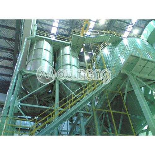 形成的球形顆粒粉料在干燥塔內逐漸沉降,與熱空氣分離,塔下部的漏斗型腔使顆粒料匯集并從出料口卸出。較細的顆粒料與干燥空氣一起由與漏斗形上部相連的抽風機抽取而進入除塵系統。