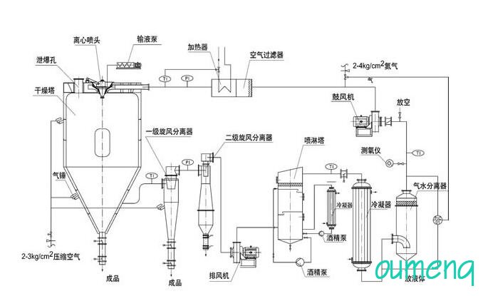 閉式循環(huán)噴霧干燥機(jī)系統(tǒng)由噴霧干燥機(jī)主機(jī)、帶空氣過濾器的加熱器、鼓風(fēng)機(jī)、水氣分離器、大小冷卻塔、噴淋塔、排風(fēng)機(jī)、一級旋風(fēng)分離器、二級旋風(fēng)分離器、泵、測氧儀以及管路與控制閥等組成。